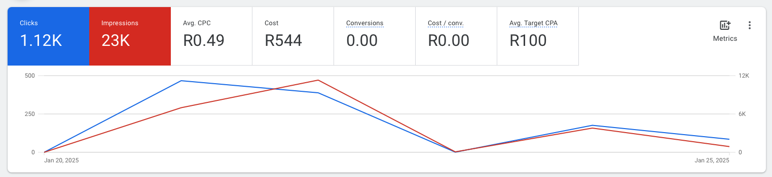 The latest Google Ads performance report paints a mixed picture. While clicks totaled 1,120—down from over 1,500 the previous week—impressions remained steady at 23,000. The average cost-per-click stayed low at R0.49, with a total ad spend of R544.