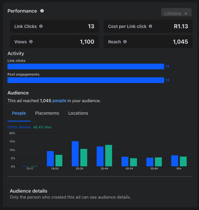 - Campaign 1: This campaign recorded 13 link clicks from 1,045 impressions, resulting in a click-through rate (CTR) of 1.24%. The cost-per-click (CPC) was relatively high at R1.13, suggesting lower engagement with the ad content.