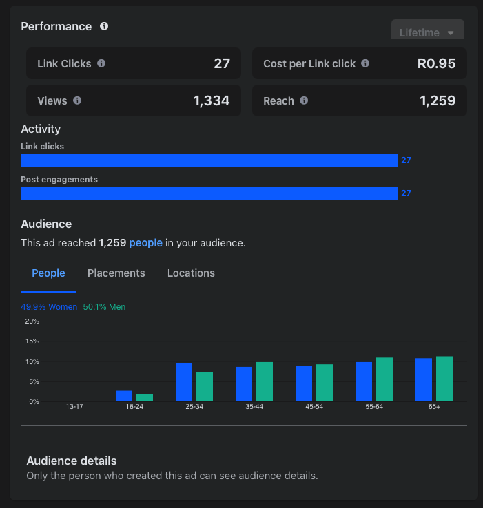 - Campaign 2: The second campaign performed better, generating 27 link clicks from 1,259 impressions, with a CTR of 2.14%. The CPC dropped to R0.95, indicating improved efficiency in driving traffic.