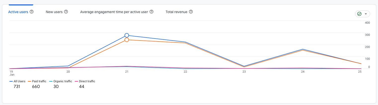 According to the performance data, the site attracted 731 total active users, with 660 coming from paid traffic, 30 from organic traffic, and 44 from direct traffic. The peak in activity occurred on January 21, after which user engagement gradually declined.