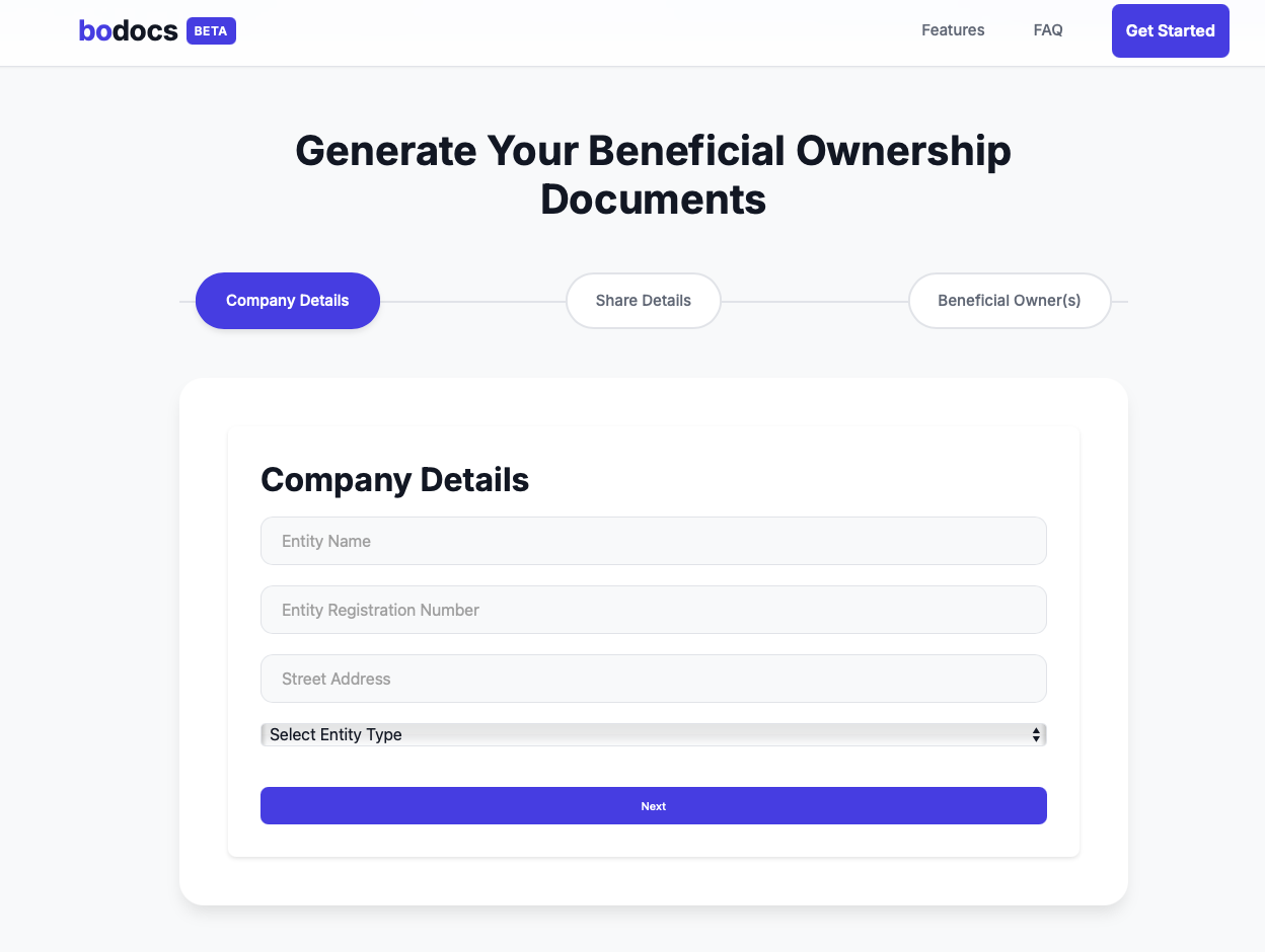 The concept was straightforward: create an easy-to-use online tool that allows users to generate signed BO (Beneficial Ownership) documents without the hassle of figuring out which documents are needed, how to create them, or dealing with the signing process before submitting them to CIPC. Users simply input their details, and the app automatically generates the required documents, fully signed and ready for submission.